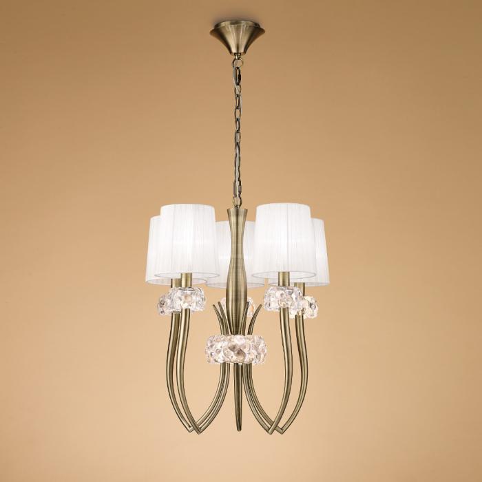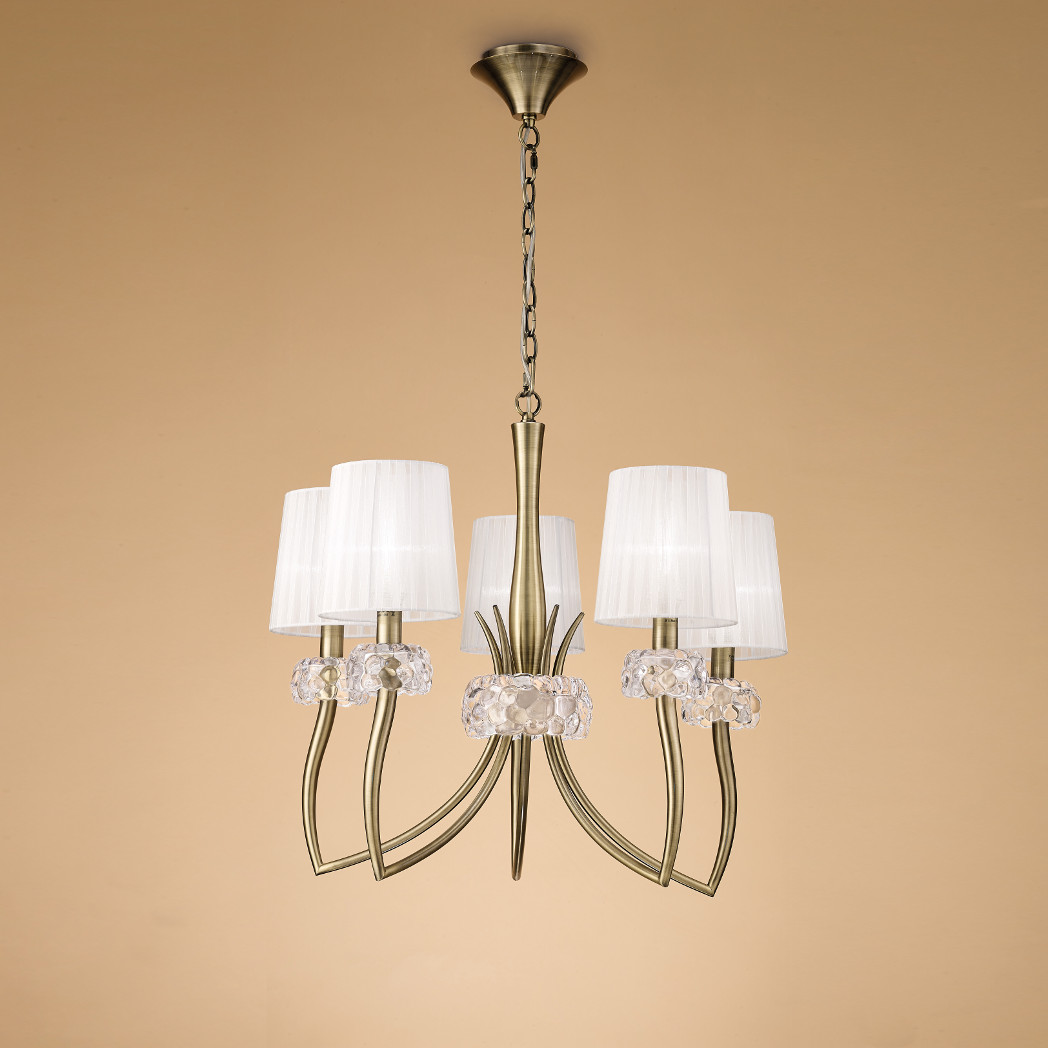 Die exquisit gestaltete Pendelleuchte der Kollektion LOEWE von Mantra bewirkt mit seinem glänzend verchromten Gestell, das mit schönen Klarglaselementen geschmückt ist, einen glanzvollen Auftritt. Vervollkommnet wird das Ensemble mit Textilschirmen aus zart durchscheinendem Organza.. Mantra LOEWE Leuchten sind in Chrom und Messing erhältlich.